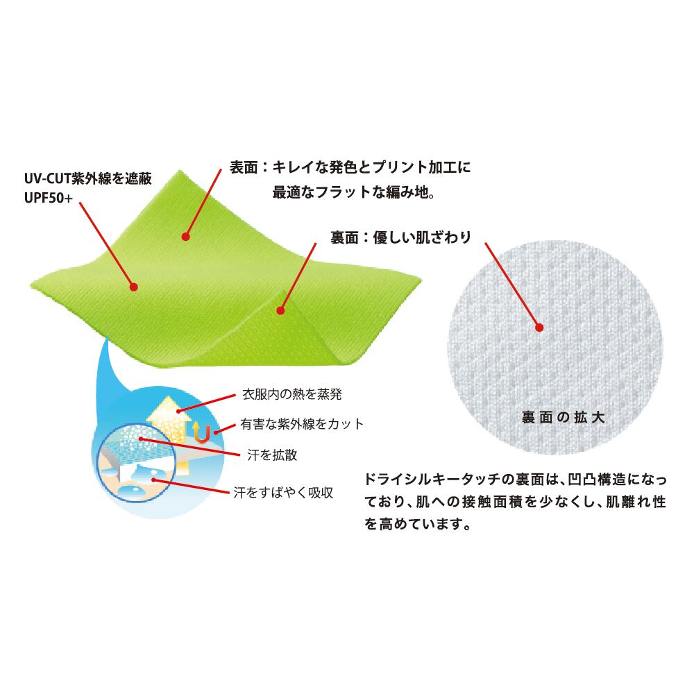 この生地には毛細管現象を応用し、生地の肌側についた汗を外側に移動させて素早く拡散、乾燥させることで不快なベトツキを軽減しています。肌から汗を吸い取り素早く乾かす、というドライTシャツの最大の特徴はそのままに、肌に接する裏側に凸凹構造を採用。これにより肌離れが高まり、まるでシルクのような肌触りを生み出しています。